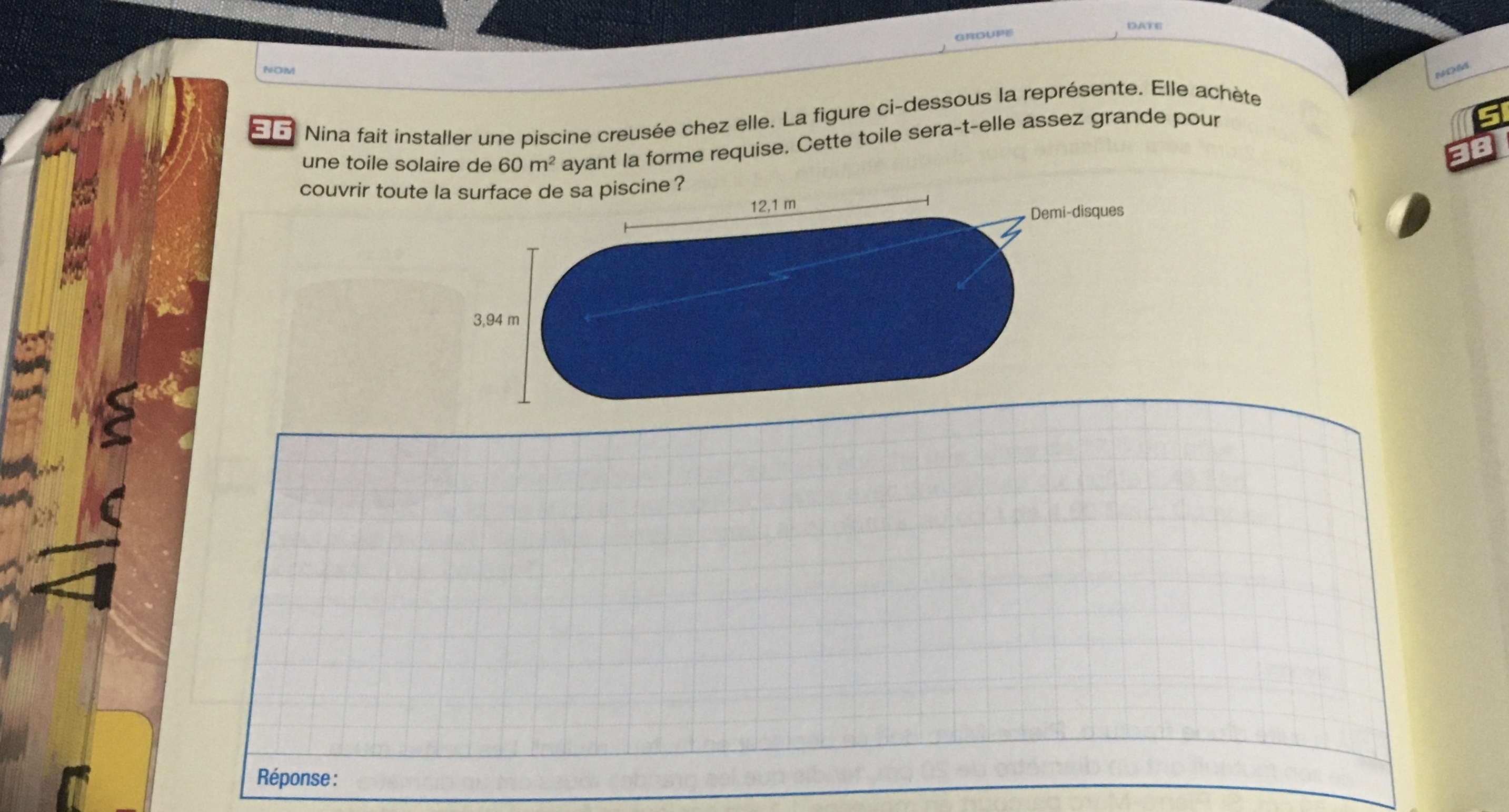 Il faut décomposer la forme en plusieurs parties. Première, au centre il y a un rectangle. Avec les mesures données, il est facile de calculer son aire. Ensuite, les deux extrémités sont des demi-disques. En les collants les un sur les autres, on peut retrouver un disque complet dont la formule pour calculer l’aire est de A=pi r2 (le 2 est un exposant). Le rayon n’est pas indiqué sur le dessin, mais le diamètre correspond à la larguer de la piscine. Rendu là, il suffit d’appliquer les équations pour trouver les deux parties de l’aire, additionner et regarder si oui ou non la toile est assez grande. J’espère que j’ai aidé !