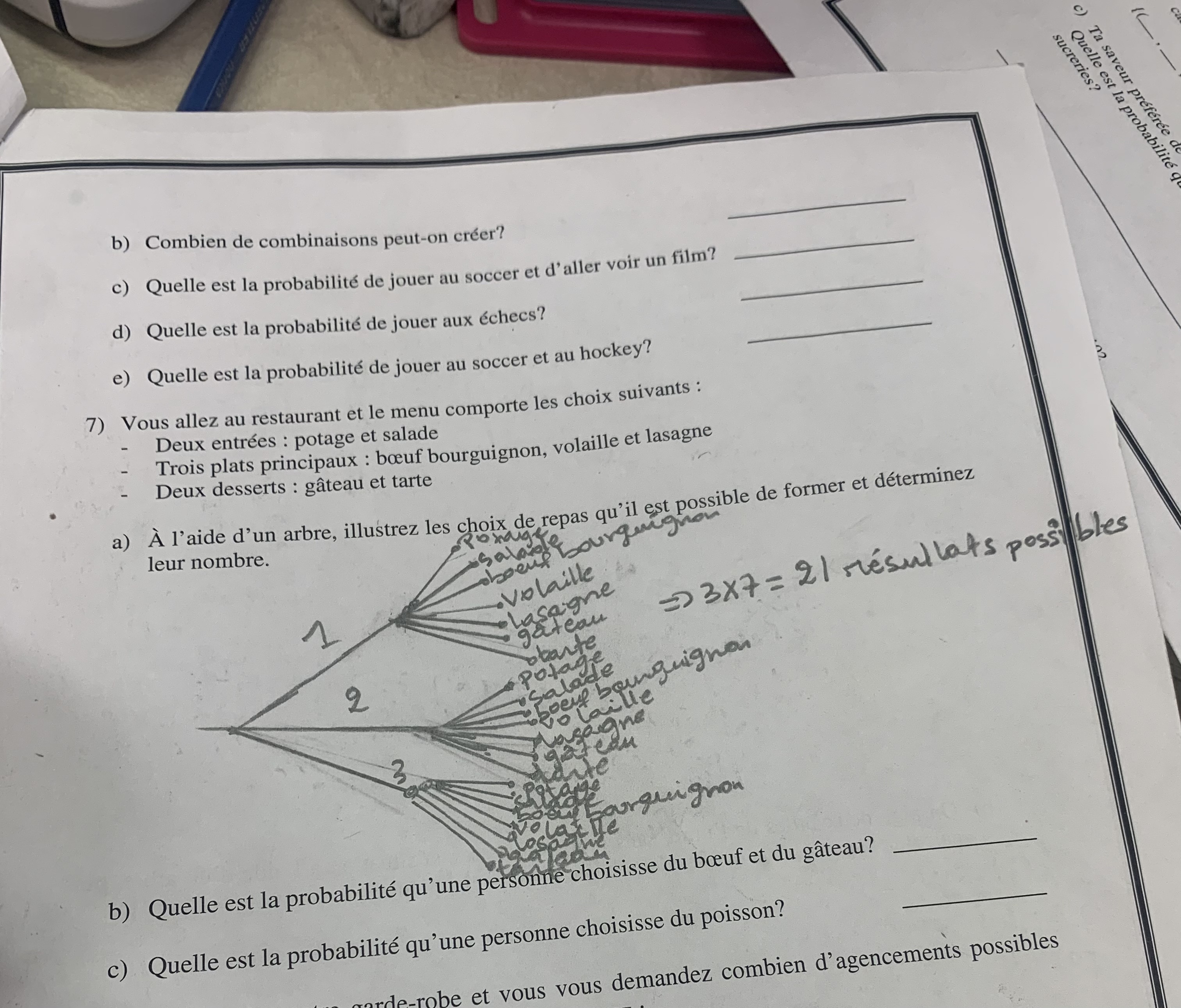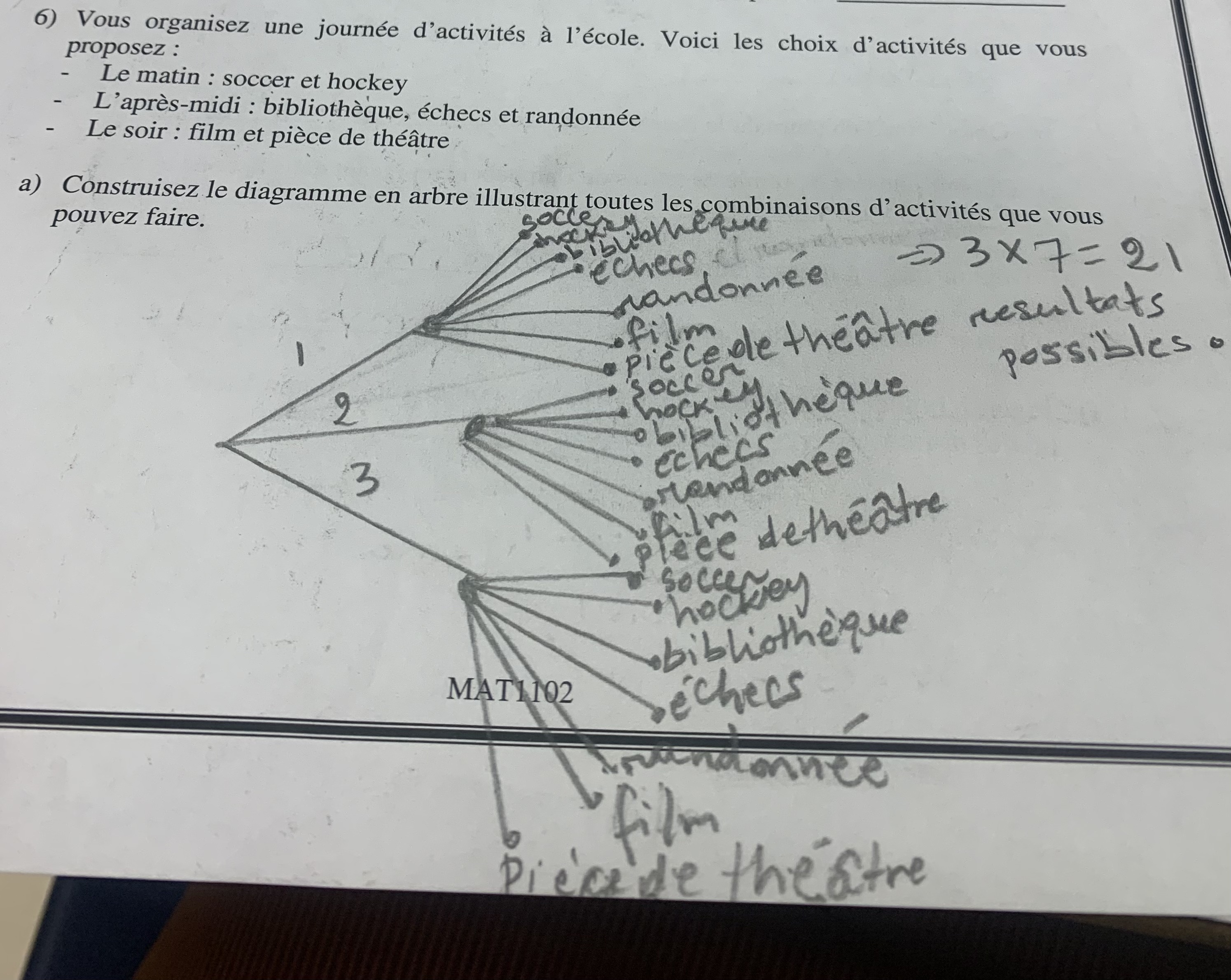 Avant de poursuivre tes démarches, je t'invite à réviser ton diagramme en arbre. En effet, il devrait d'abord être séparé en deux branches, soit soccer et hockey, pour le matin.