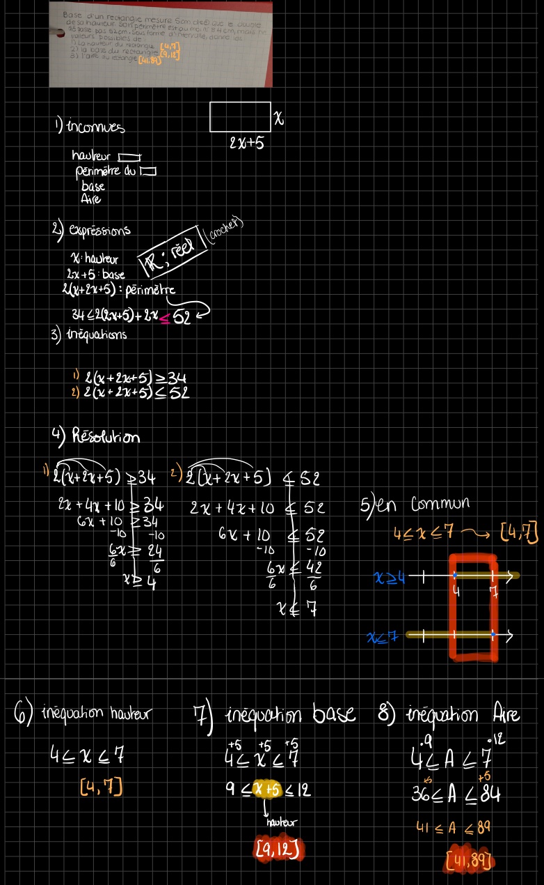 Tu as bien débuté le problème pour retrouver la valeur de la hauteur. Par contre, tu as fait une petite erreur lorsque tu as retrouvé la base du rectangle, la base correspond au double de la hauteur plus 5. Je te laisse corriger ton numéro!
