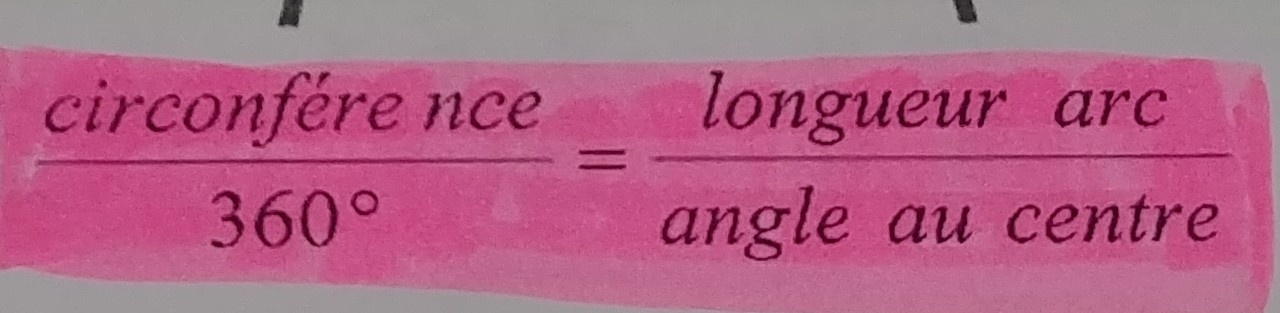 Grâce au rayon, tu vas pouvoir trouver la circonférence en fessant π x d (diamètre) et ensuite tu vas mettre la circonférence sur 360° qui est équivalent à la longueur de l'arc sur angle au centre.