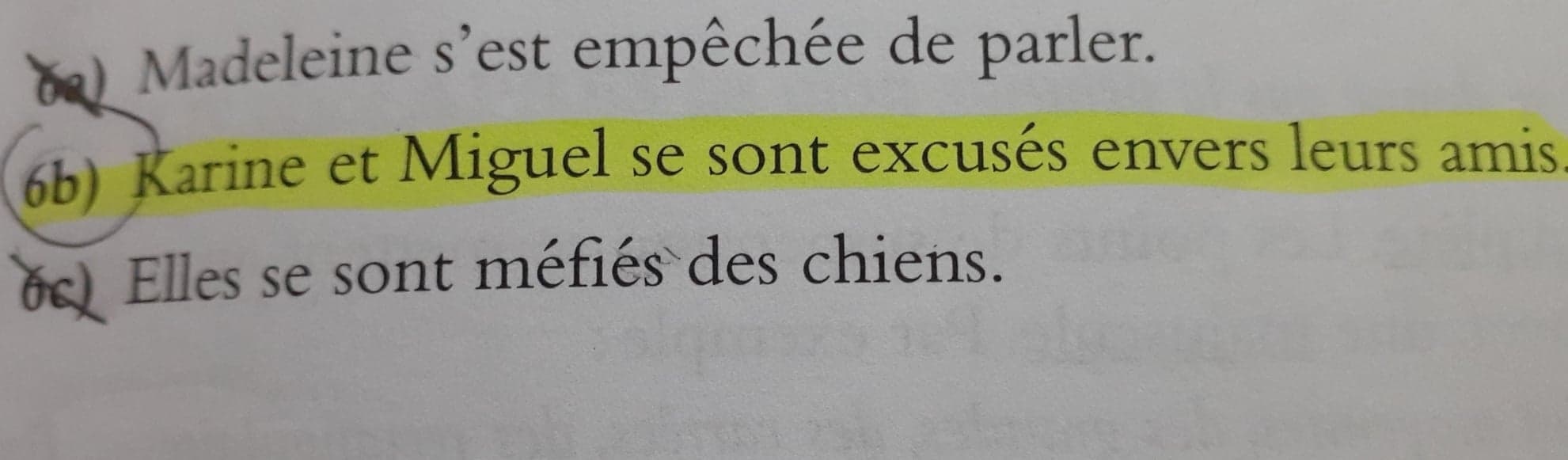 À mon avis, la deuxième est fausse car Karine et Miguel sont généralement des noms de filles donc excusés a du etre aussi au féminin.