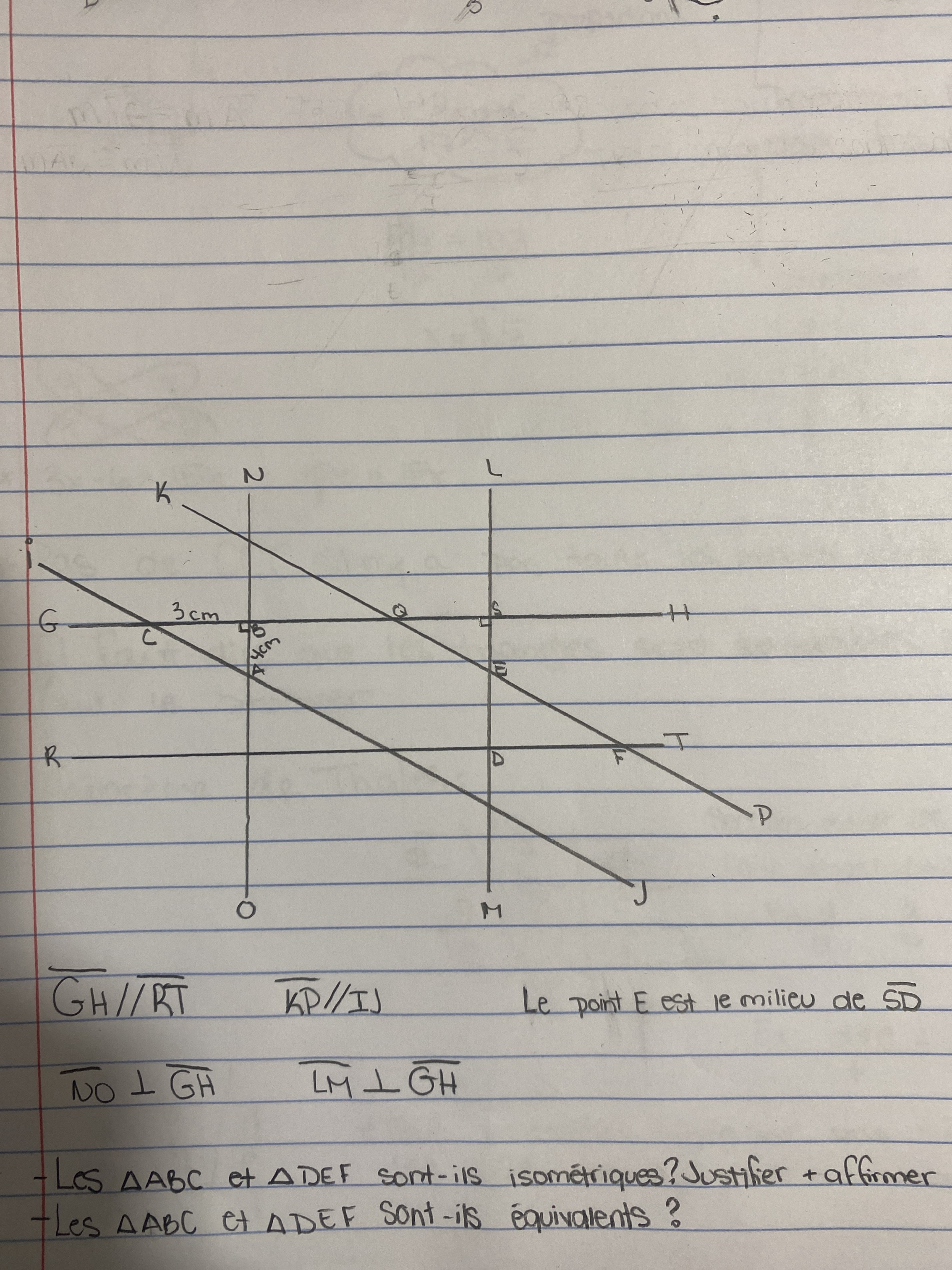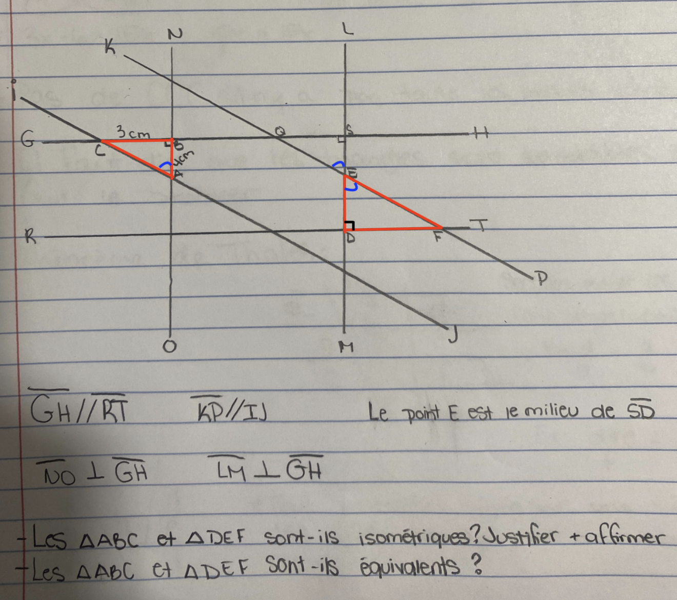 En fait pour justifier qu'ils sont isométriques, il faudra utiliser ici les droites parallèles et perpendiculaires ainsi que tout ce qui concerne deux droites parallèles coupées par une sécante. Donc alternes-internes, correspondant, etc.