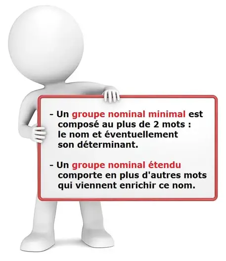 Un groupe nominal minimal est formé avec 2 mots au maximum : un nom (commun ou propre) accompagné le plus souvent de son déterminant (facultatif).