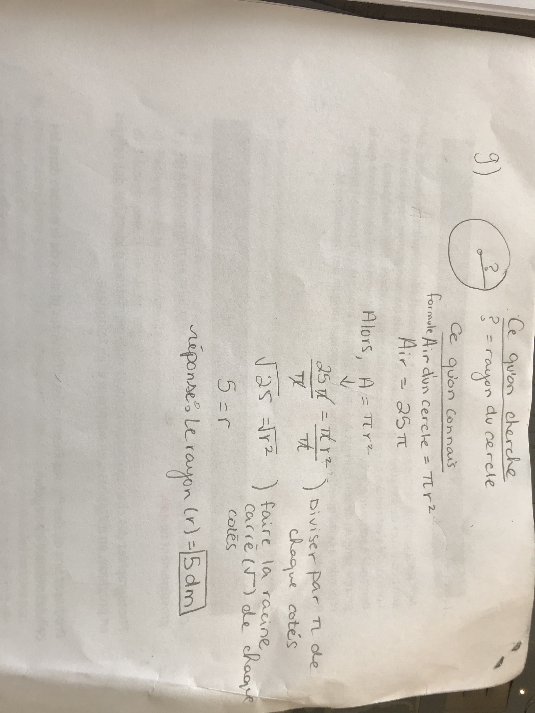 Salut, je crois que j’ai réussi ton numéro, ça me donne comme réponse un rayon de 5dm. J’ai pris une photo de ma démarche pour t’aider.