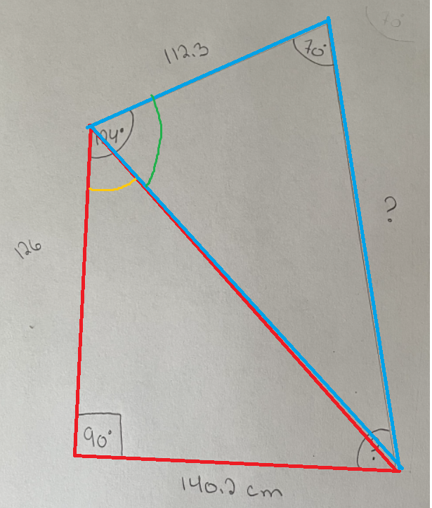 Le triangle rouge est rectangle, ainsi, tu peux trouver la mesure de l'angle en orange et l'hypoténuse. Une fois cela fait, tu trouves la mesure de l'angle vert = 124 - angle orange.