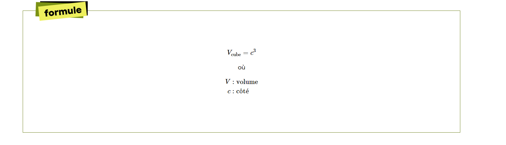 La formule pour le volume d'un cube est la suivante