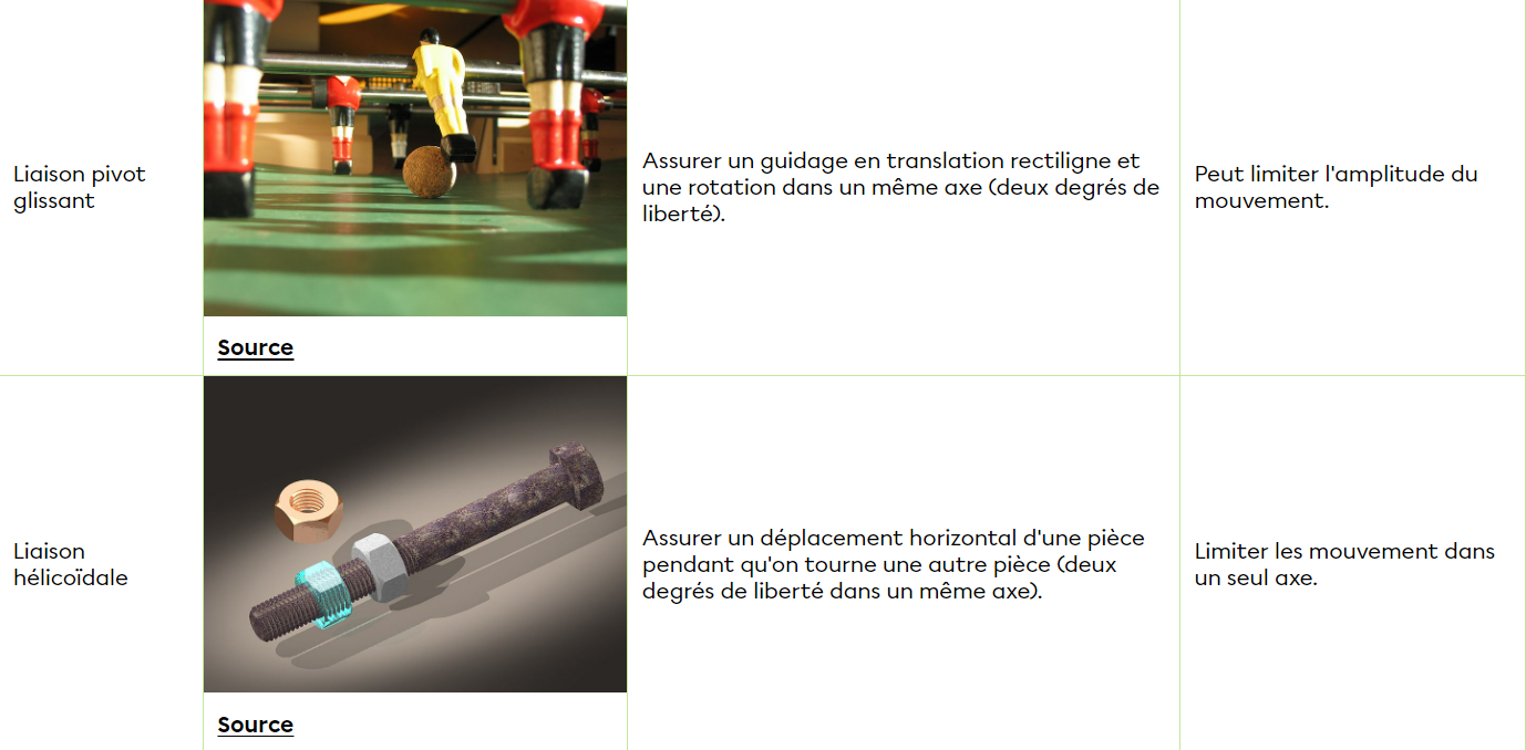 Le pivot glissant permet d'avoir une translation dans un axe ainsi qu'une rotation autour de ce même axe. En revanche, l'hélicoïdal permet uniquement la translation s'il y a une rotation de l'objet. Voici une image qui résume ces deux liaisons: