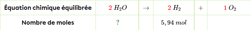 Nous savons que pour 2 moles de H2, il y a 2 moles de H2O. Ainsi, si nous faisons le rapport suivant on peut trouver la quantité de H2O: