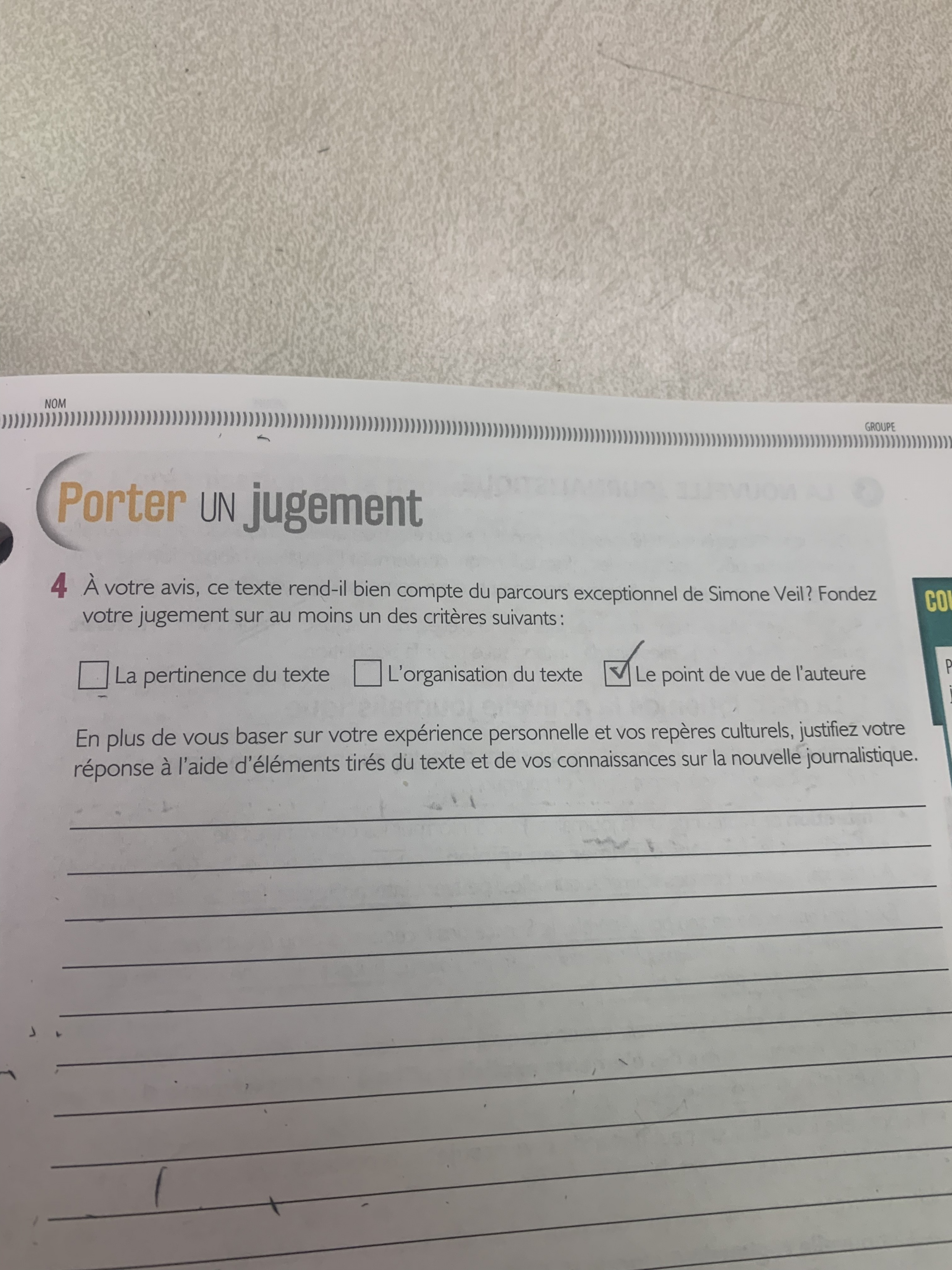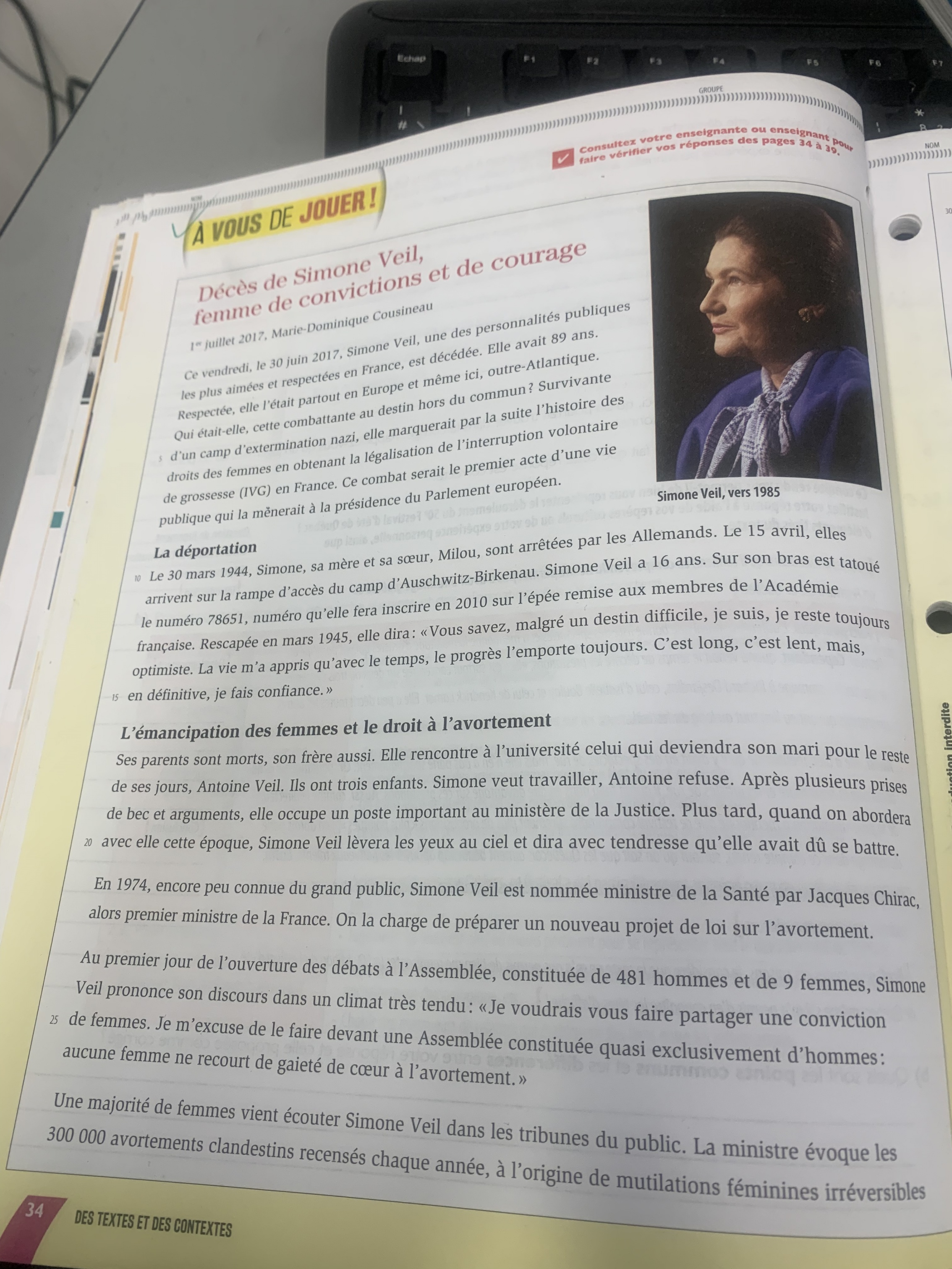 Tu dois repérer dans le texte des éléments qui pourront t'aider à porter un jugement sur la manière dont Simone Veil est présentée (ainsi que ses accomplissements).