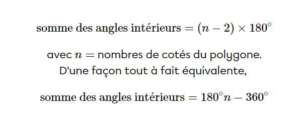 Plus simplement : (le nombre de coté d'un polygone - 2) x 180° = la somme des mesures des angles du polygone