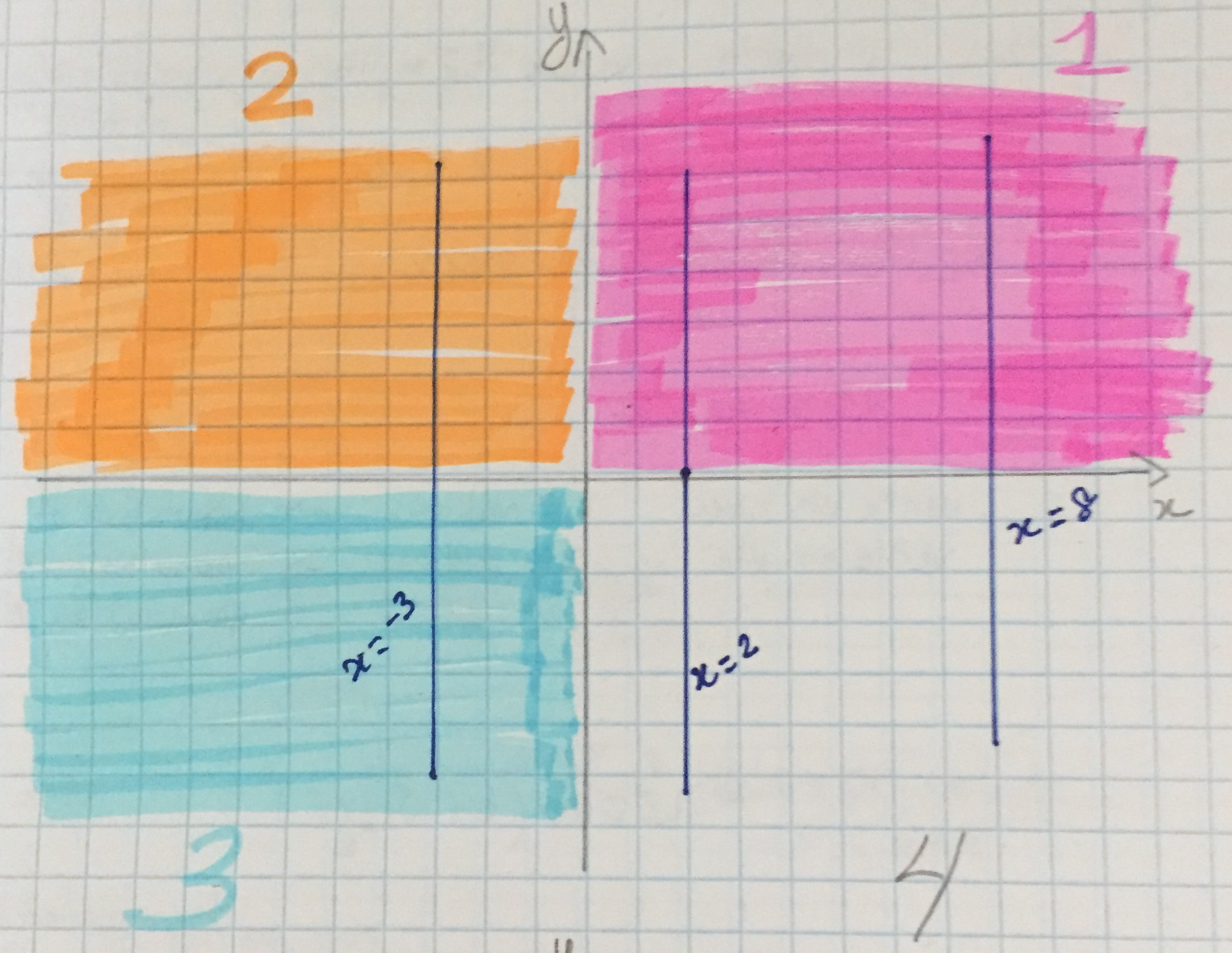 À l'étape 1 par exemple x = -3, x = 2 et x = 8 sont 3 droites verticales qui passent par les quadrants 1 et 2 (mais aussi 3 et 4), c'est tout de même curieux comme demande: des quadrants correspondant verticalement auraient plus de sens. C'est peut-être une erreur :-) les quadrants identifiés à l'étape 1 seraient pour l'étape 2 et inversement.