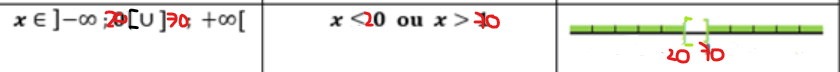 par exemple: x € ] - ♾, 20 [ U ] 70, + ♾ [