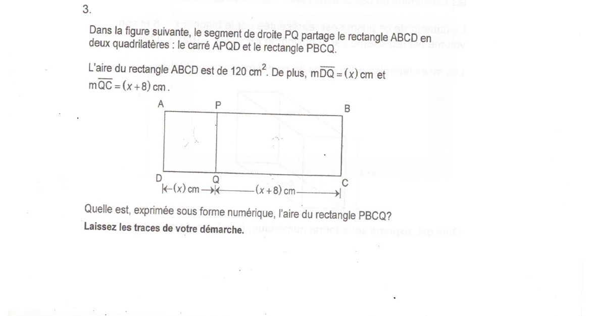 Tu sais que l'aire d'un rectangle est sa base multipliée par sa hauteur. La base du rectangle ABCD est donnée par mDQ + mQC, soit (x)cm + (x+8)cm. La hauteur est (x)cm puisque APQD est un carré. Tu connais aussi l'aire de 1200 cm².