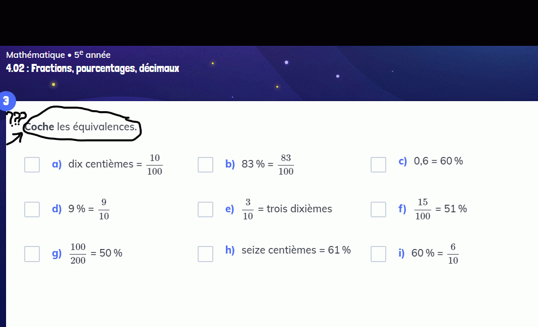 Par exemple, est-ce vrai en d) que 9% (neuf pourCENTS) = 9/10? Non, car 9% représentent 9/100 pas 9/10.