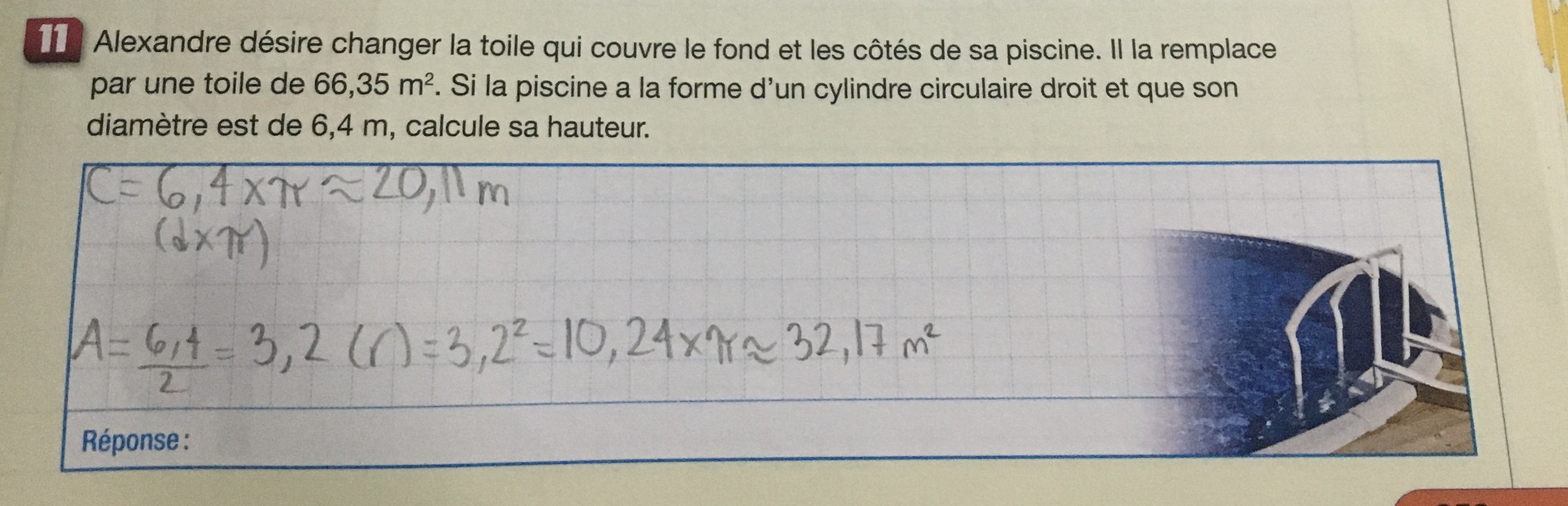 Salut! J’ai commencé un exercice en math, mais je suis bloqué à la moitié du question. La question nous demande de trouver l’hauteur de la piscine en forme d’un cylindre circulaire droit. J’ai réussi à trouver la circonférence et l’aire du disque/ de la base. J’ai besoin d’aide pour continuer ce problème. Quelqu'un peut-il m'aider à finir cet exercice svp?