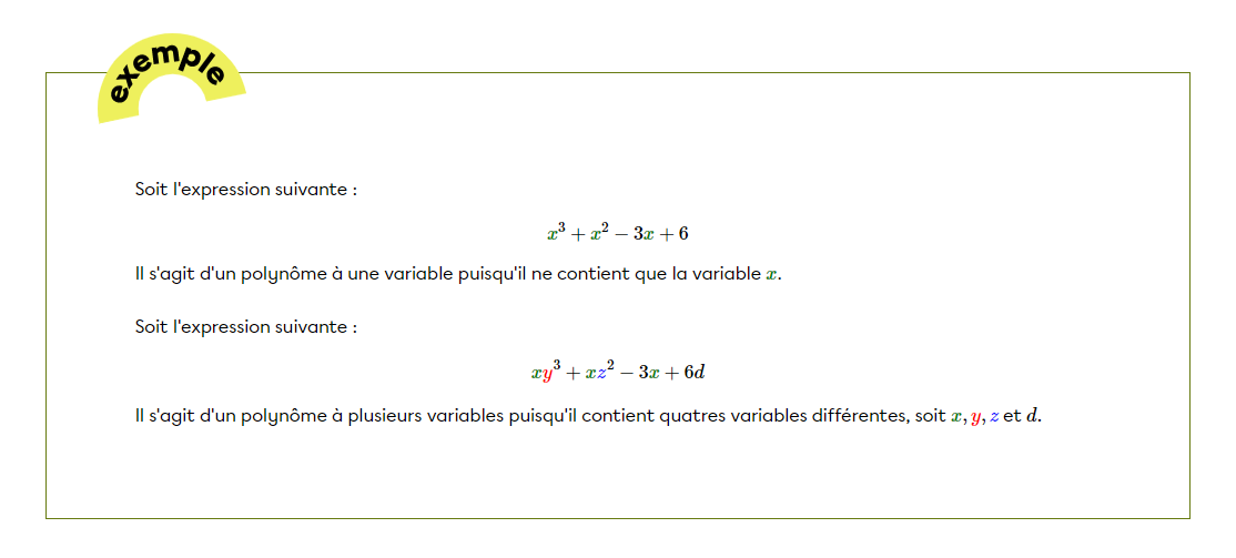 Lorsqu'un polynôme est formé de deux termes, il est qualifié de binôme, alors qu'il est nommé trinôme lorsqu'il est composé de trois termes. Pour tous les cas où il y a quatre termes et plus, on qualifiera l'expression de polynôme.
