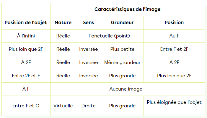 Ce tableau résumé devrait t'aider à répondre à ces questions. Tu y trouveras le sens, la grandeur et la position de l'image selon la position de l'objet.