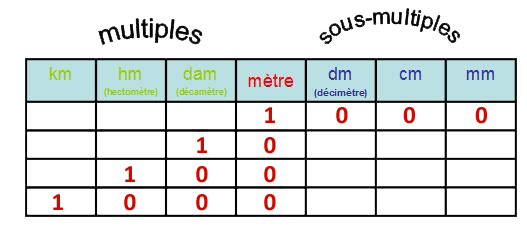 Pour faire un changement d'unité de distance, on doit multiplier par 10 à chaque fois que l'on fait un bond vers une unité plus petite.
