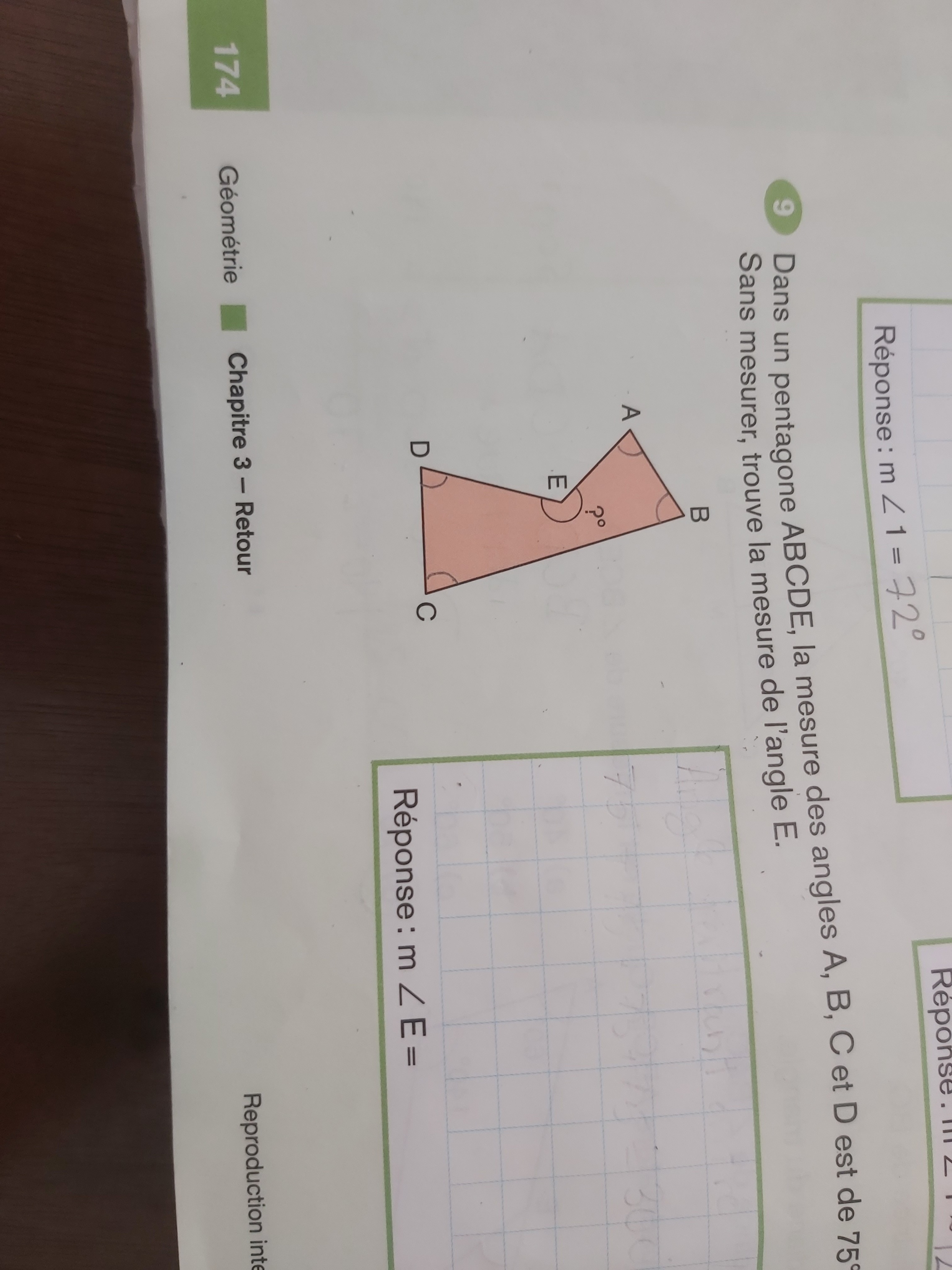 Dans ton numéro, c'est écrit que les angles A, B C et D sont de 75 degrés. Alors ils ont tous la même mesure à part E. Alors tu dois faire (5-2)x180 pour savoir combien la somme des mesures des angles intérieurs du polygone mesure. Ça fait 540. Alors tu fais 540-75-75-75-75 et tu auras ta réponse 😉