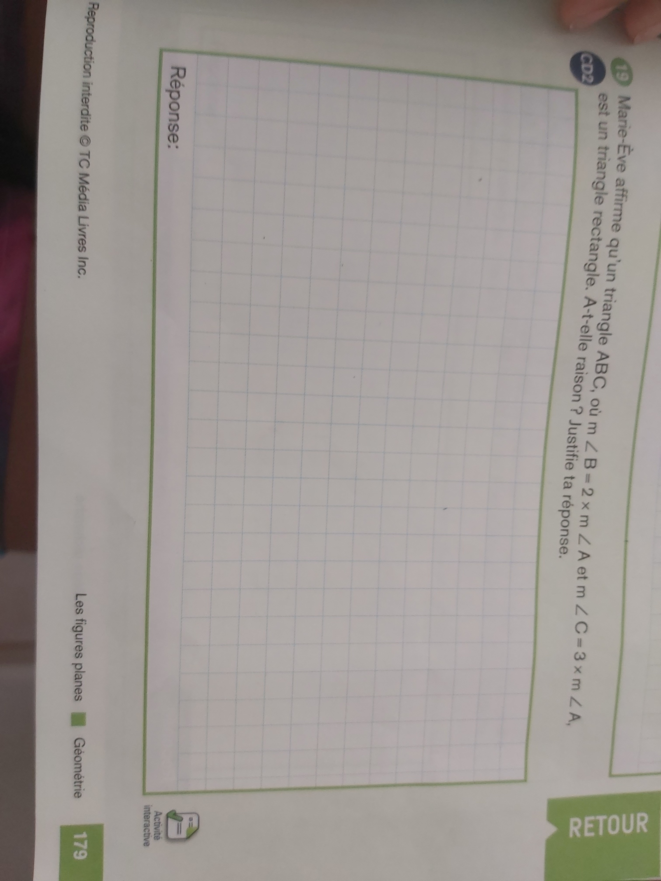On te dit que le triangle ABC a un angle B deux fois plus grand que son angle A, et un angle C trois fois plus grand que son angle A. Sachant cela, on doit vérifier si le triangle ABC est rectangle.