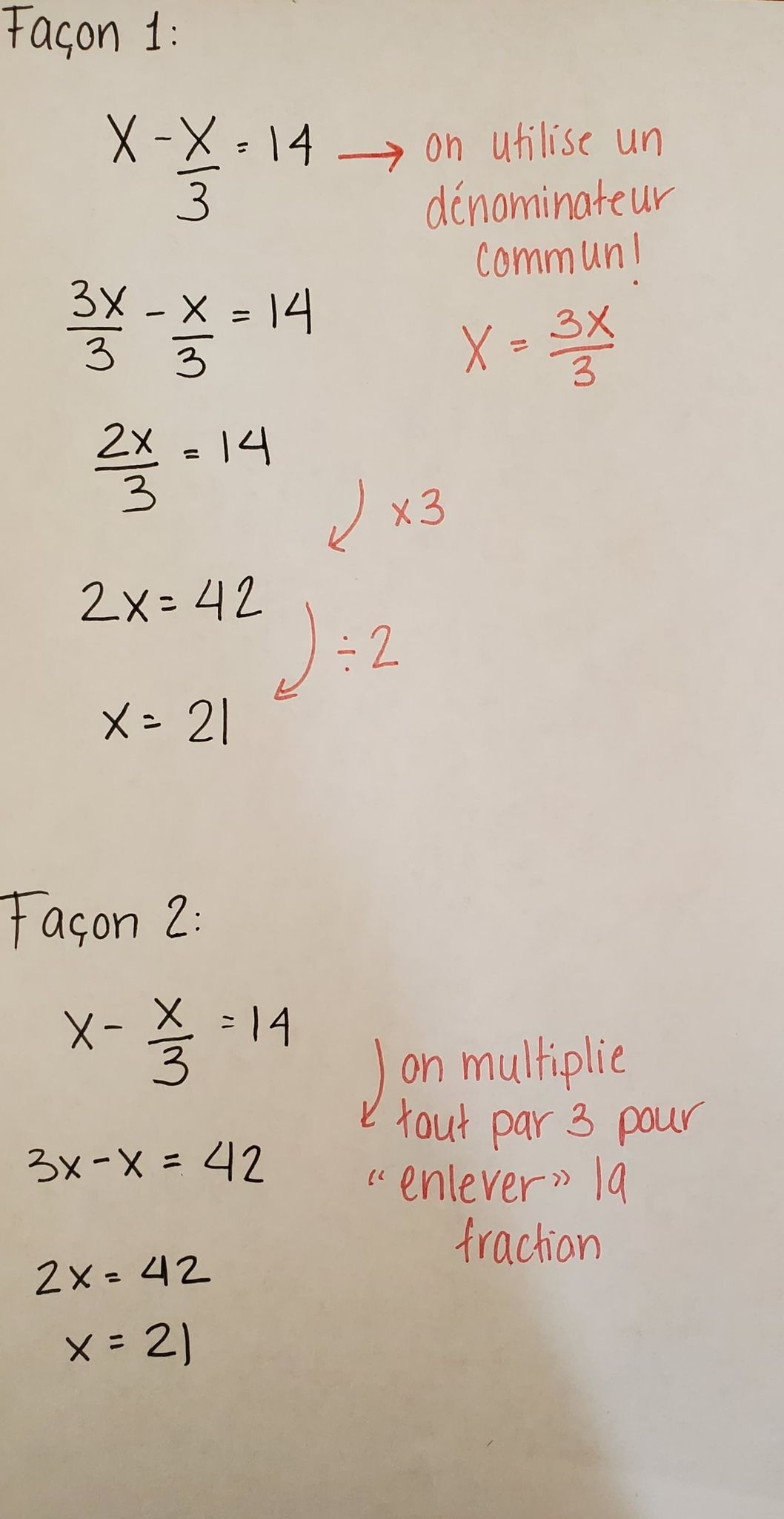 2xsur 3 = 14 ou bien cela (dure a écrire sur l'ordinateur) 2x/3 = 14. Il me semble qu'il aurait juste fallu multiplier par 3 pour se débarasser du 3 mais ca ne semble pas la maniere de faire.