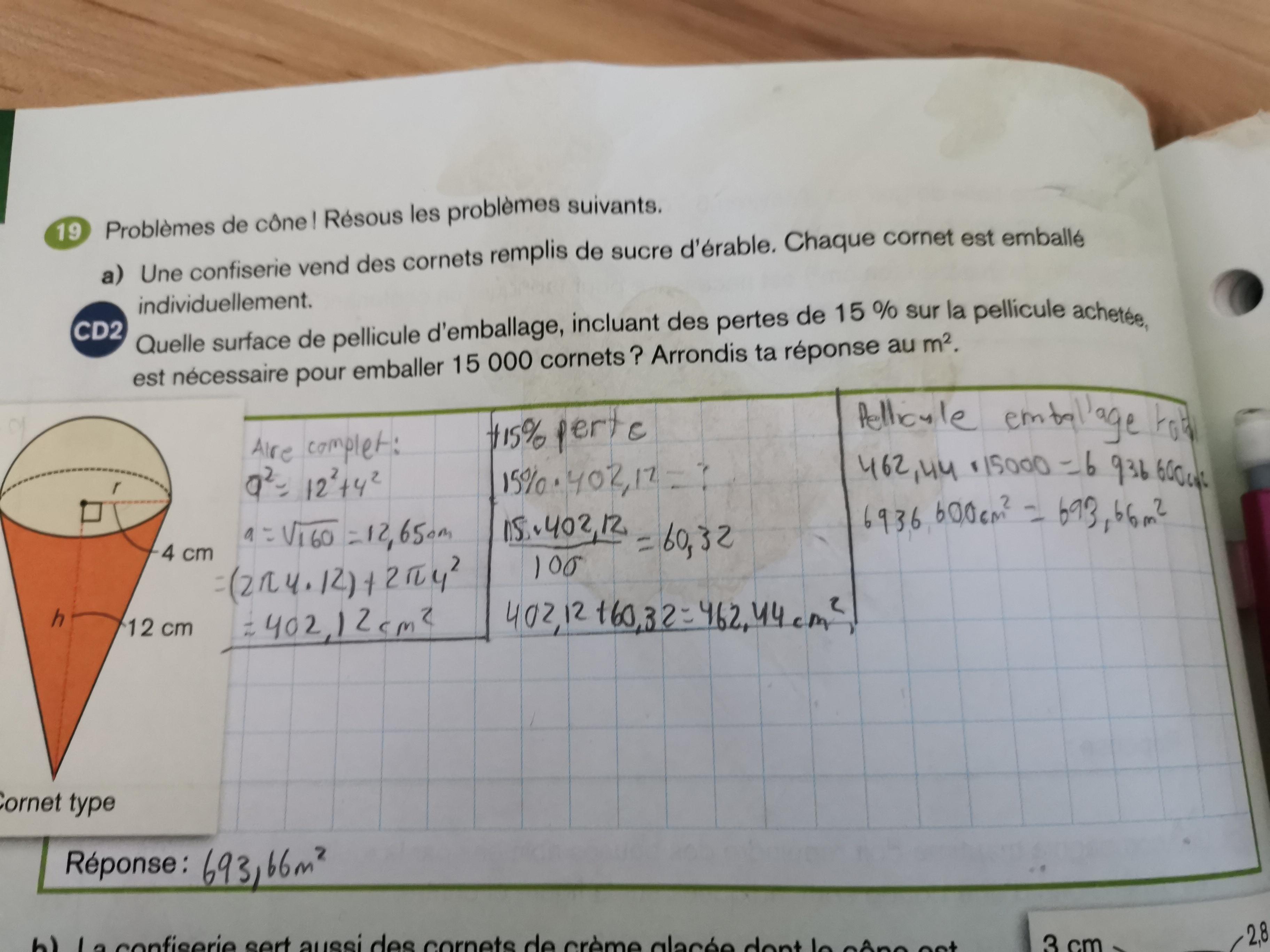 Tu n'utilises pas la bonne formule pour trouver l'aire latérale du cône.