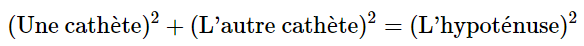 Il affirme aussi que l'hypoténuse est de 11 cm. Pour trouver l'hypoténuse d'un triangle rectangle dont on a les mesures des cathètes, on applique le théorème de Pythagore. On aura alors l'équation suivante :