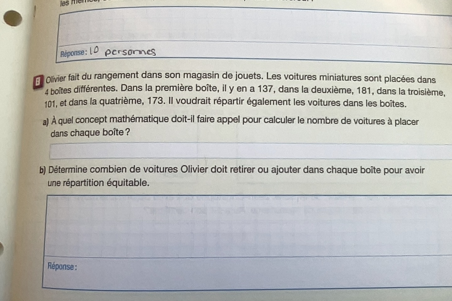Par exemple, si on a 1000 voitures au total, il y aura donc 250 voitures dans chaque boite (100 voitures ÷ 4 boites = 250 voitures par boite). Puisque la première boite contient initialement 137 voitures, il faudrait donc en rajouter 113 pour avoir en 250 (250 - 137 = 113). Tu dois faire cela pour chacune des boites.