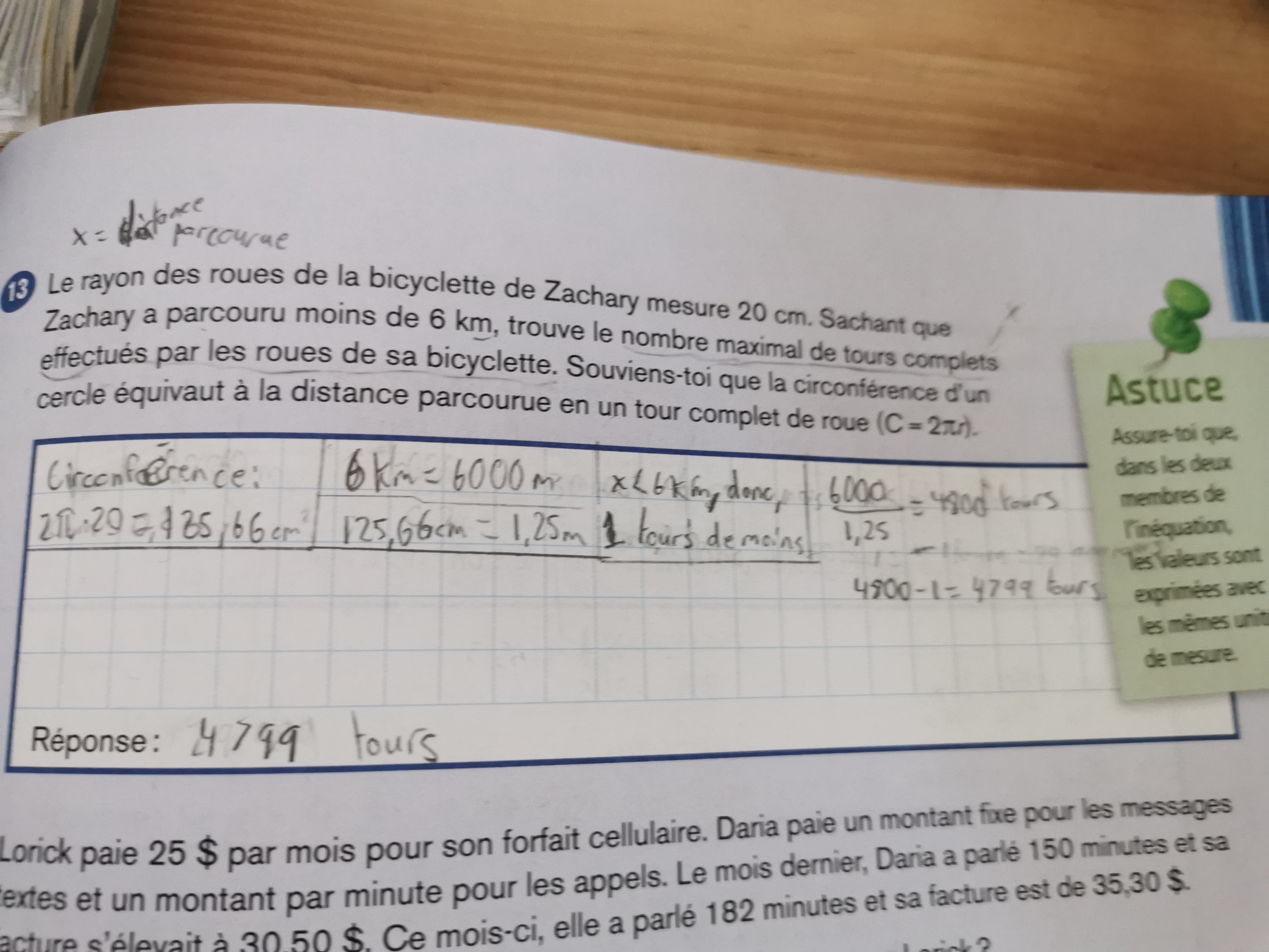 De plus, pourquoi as-tu enlevé un tour de la réponse que tu as obtenu? On te dit qu'on effectue moins de 6 km, mais lorsqu'on tronque notre réponse à 4774, on sait alors qu'on a effectué moins de 6 km, puisqu'on a enlevé 0,64 tour, donc une certaine distance!