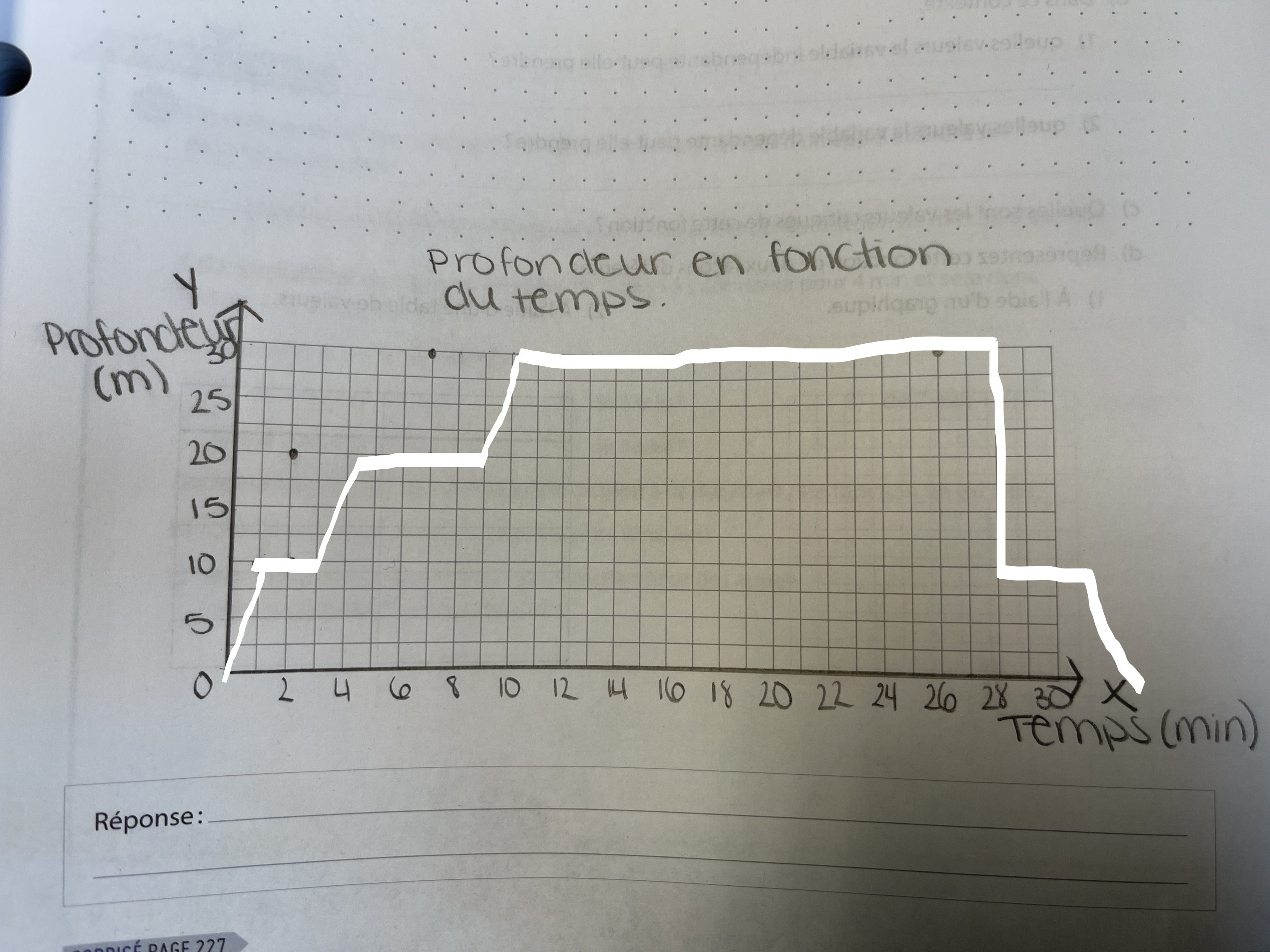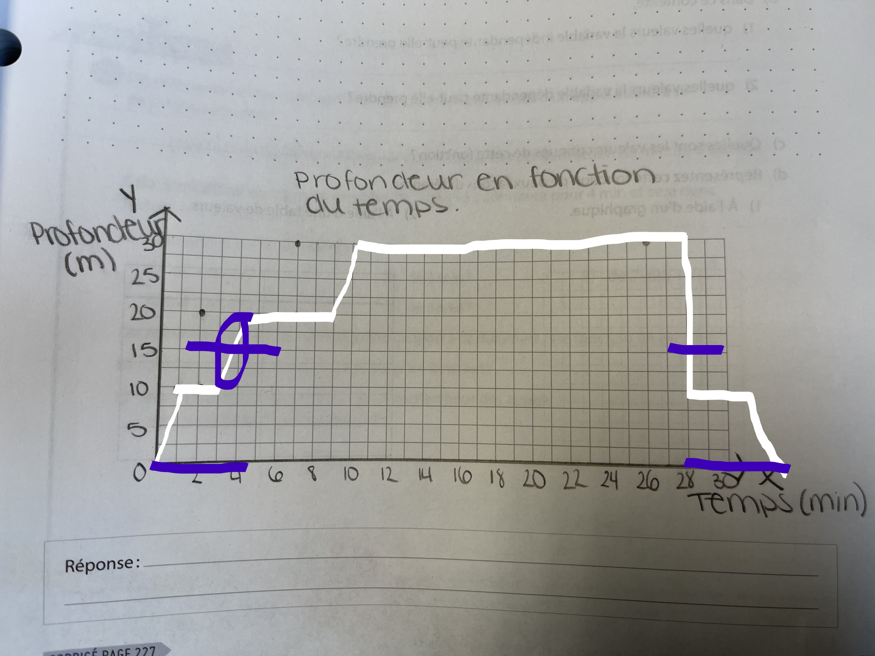 Petit indice supplémentaire : elle a descendu de 10 m en 1 minute. On te dit qu'elle descend à une vitesse constante et remonte également au même rythme. Tu devrais alors être en mesure de calculer le temps que ça lui prend de 10 à 20m et de 30 à 3m.