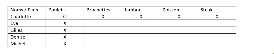 On commence d'abord par faire un tableau à deux entrées, avec les noms à gauche et les plats en haut.