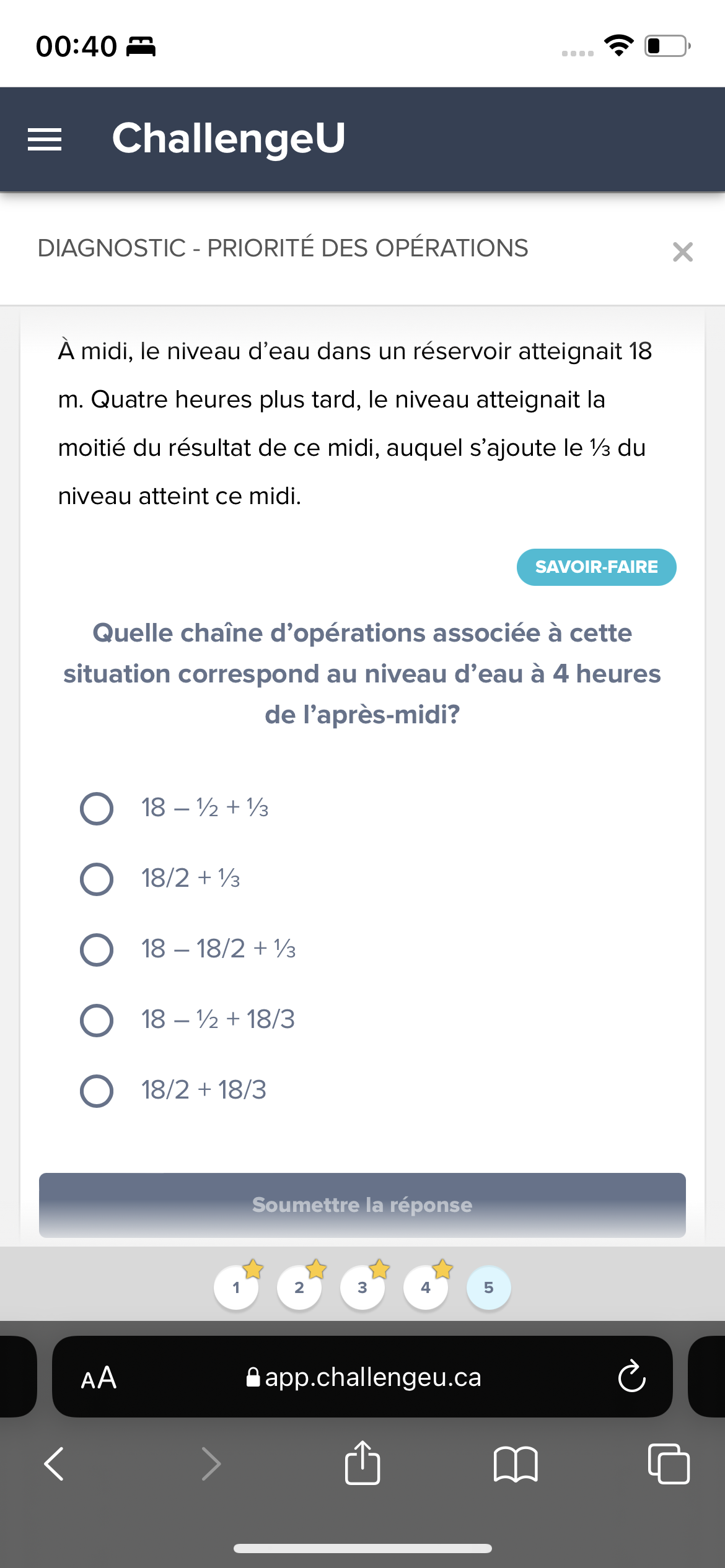De plus, selon l'énoncé suivant : "auquel s'ajoute le 1/3 du niveau atteint ce midi", on détermine alors qu'on ajoute à cette moitié le 1/3 de 18.