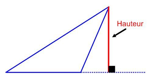 Lorsque tu es confronté à un triangle avec une hauteur extérieure, il est important de rapporter le sommet du triangle de façon perpendiculaire à un segment. Ainsi, dans la photo suivante, on continue la base du triangle pour que la hauteur extérieure arrive avec un angle de 90º à la base (il est donc perpendiculaire).