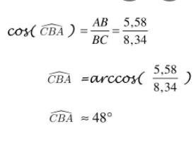 Comme expliqué par RenardComique299, tu dois effectuer, à l'aide de ta calculatrice, l'arccos (ou cos^-1) de la fraction. Voici un exemple de calcul similaire :