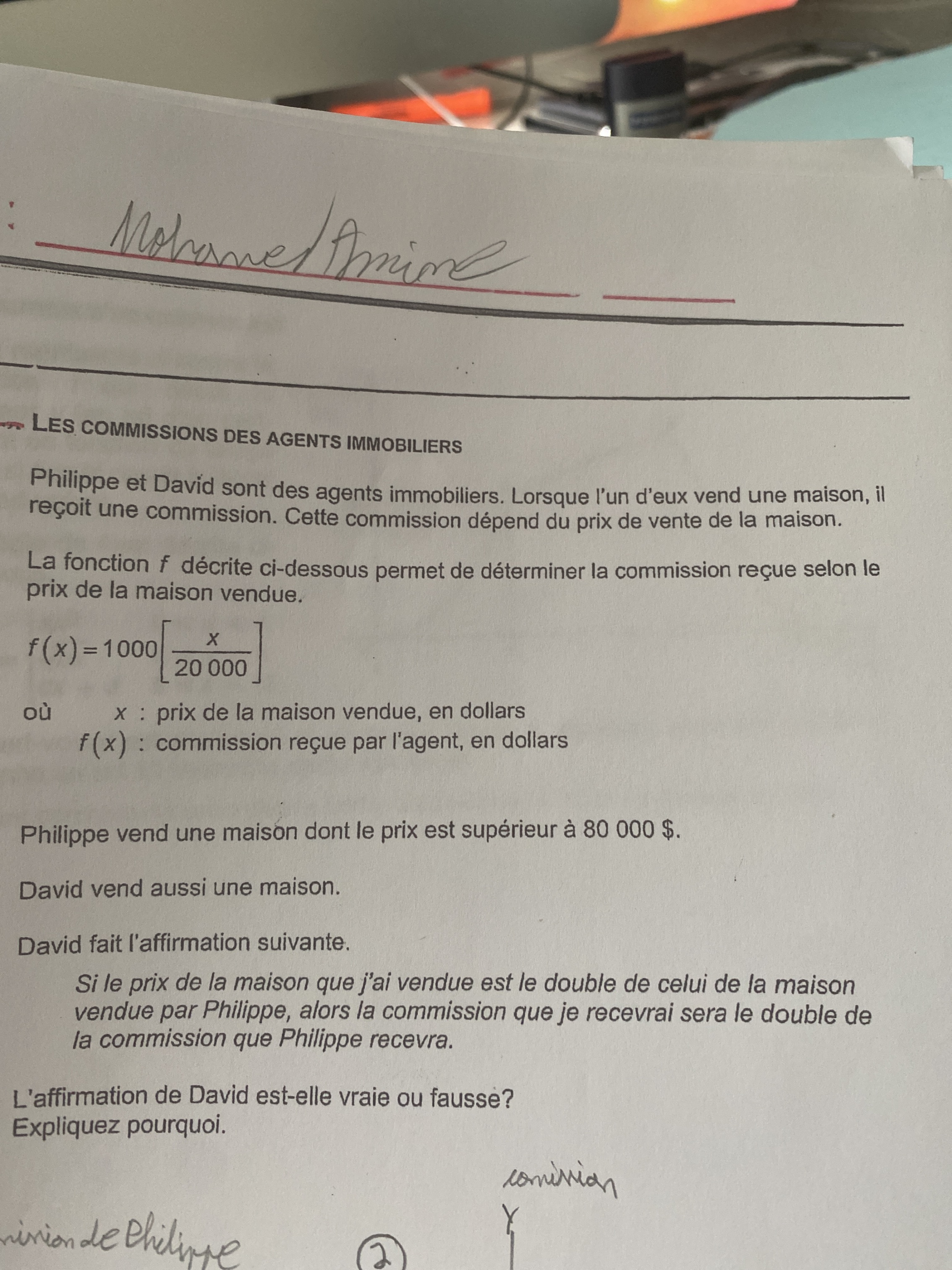 David dit que si le prix de la maison qu'il vend est de 2x (deux fois le prix de la maison vendue par Philippe) alors il aura 2f(x) c'est-à-dire deux fois le prix de la commission de Philippe