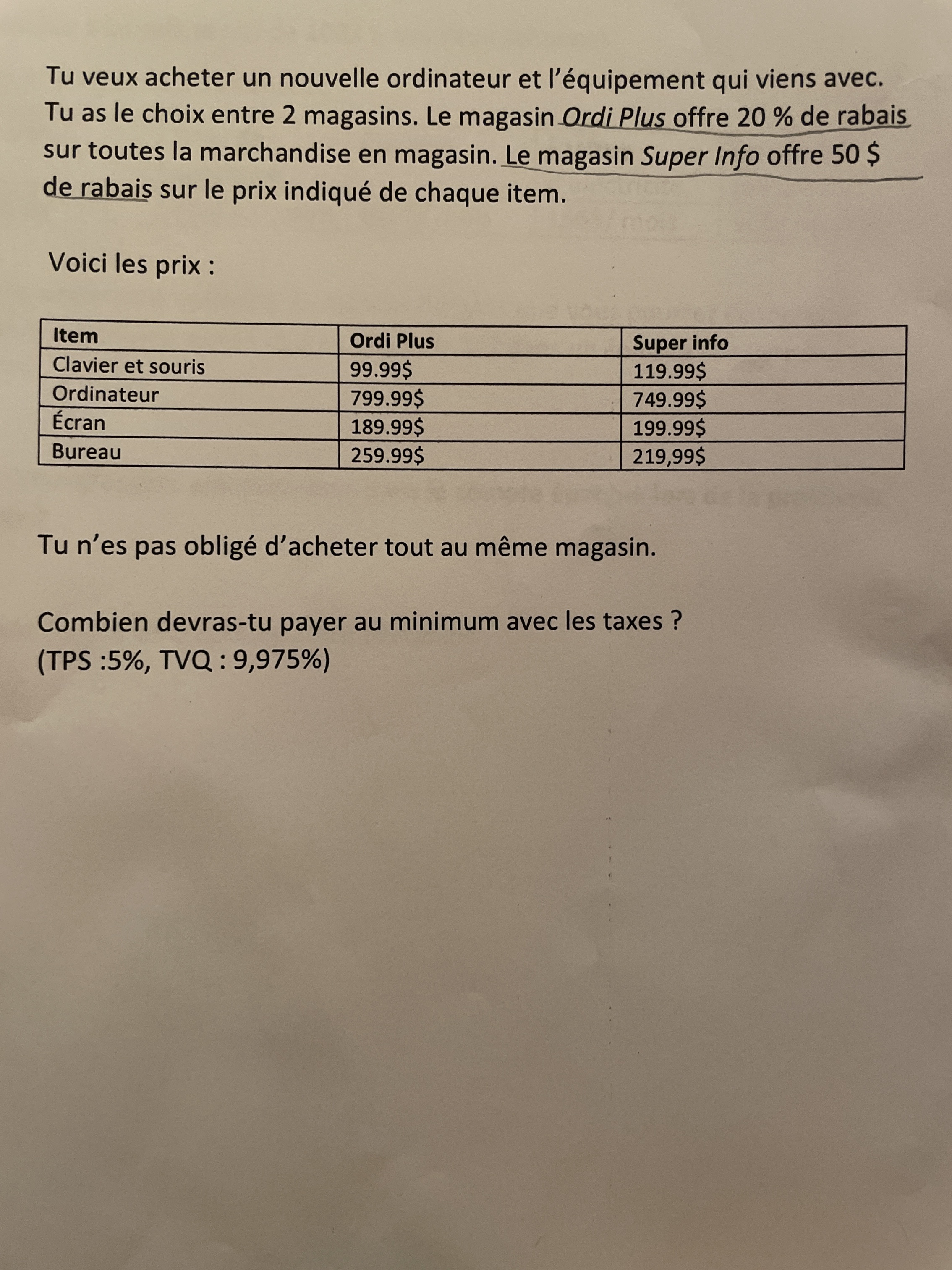 Par exemple, le clavier et la souris coûtent 99,99$ et sont en rabais à 20% chez Ordi Plus (99,99$ moins 20% de 99,99$), tandis qu'ils coutent 119,99$ moins 50$ chez Super Info.