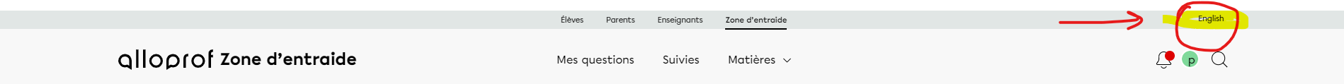 En haut à droite il y a un bouton ¨English¨. Quand on clique dessus, ça nous amène à alloprof en anglais, sauf que malheureusement ce n'est pas toutes les matières qui sont disponibles en anglais.