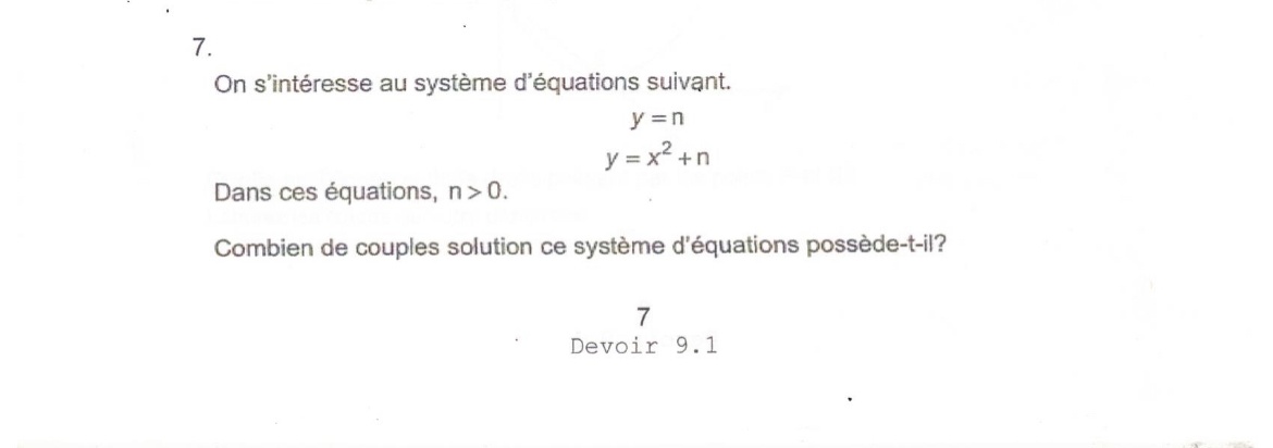 Tu remplaces y dans la 2e équation et tu trouves que x=0. Étant donné que y=n et que n peut prendre une infinité de valeurs différentes, il y a une infinité de couples solution, mais toutes de la forme (0, n) avec n>0.