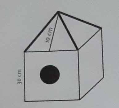 Pour calculer l'aire de cette cabane, on doit calculer l'aire des 5 faces du cube, l'aire des 4 faces de la pyramide, et y déduire l'aire de l'ouverture en forme de cercle.