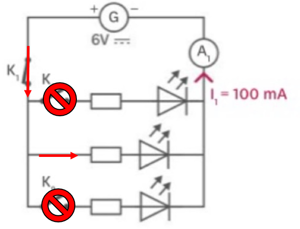 Prenons le premier cas où K\(_1\) seul est fermé. Le courant n'a donc qu'un seul chemin possible à prendre :
