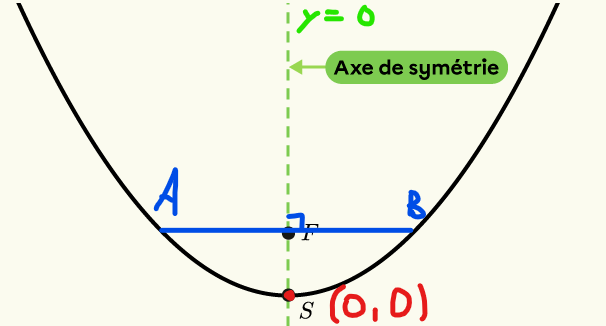 Une droite passant par le foyer de la parabole et qui est perpendiculaire à son axe de symétrie est appelée latus rectum. La longueur du latus rectum de la parabole est 4c. Ainsi, le segment AB est d'une longueur de 4c. Une fois c trouvé, il ne restera plus qu'à multiplier la valeur par 4 pour trouver AB.