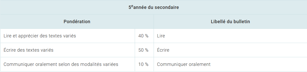Exceptionnellement, pour l’année scolaire 2021-2022, la note obtenue par l’élève à l’épreuve unique d’écriture comptera pour 20 % pour la compétence Écrire des textes variés, au lieu de 50 %, comme c’est le cas habituellement.
