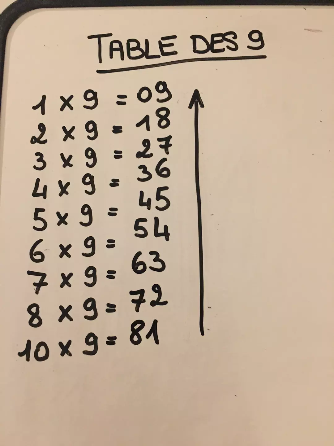 Bonjour DiamantInsolite3942! Pour apprendre la table du 9, il vous suffit d'écrire les chiffres à multiplier les uns en dessous des autres. Pour le résultat, commencez par écrire le premier chiffre de haut en bas, de 0 à 8. Pour le deuxième chiffre, procédez de la même manière, mais de bas en haut, de 1 à 9 :