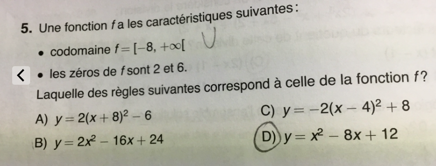 Tu as raison en B le sommet de la parabole se trouve en (4, -8) alors qu'en D elle est en (4, -4): les valeurs de la fonction en B vont bien de -8 à l'infini alors qu'en D elle vont de -4 à l'infini.