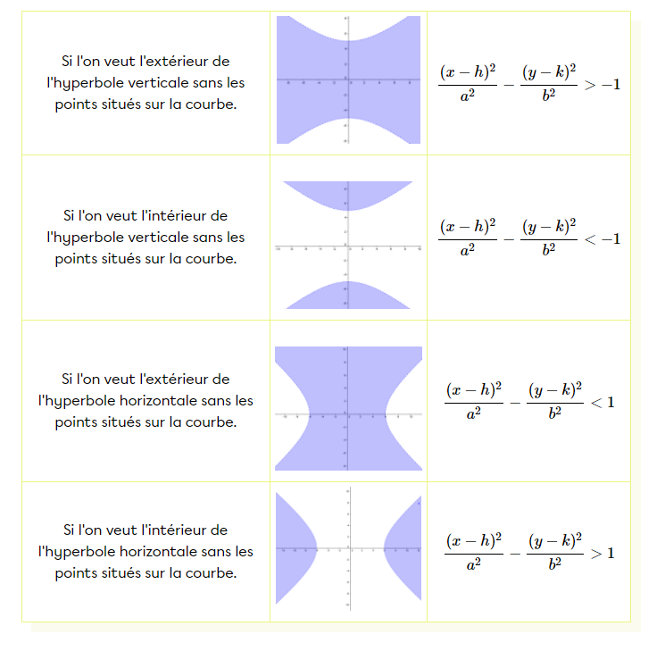 Pour trouver l'inéquation dont la solution était représentée dans le plan, on doit changer \(=\) pour \(<\) ou \(>\) (ce n'est pas \(\geq\) ou \(\leq\) car l'hyperbole est tracée en pointillés). Une façon de procéder est de faire un test avec un point. Par exemple, on sait que \((-24, \, 0)\) est le sommet, donc un point comme \((-25, \, 0)\) sera nécessairement dans l'ensemble solution. \[\frac{(-25)^2}{576} - \frac{(0)^2}{100 } \ \ \mbox{?} \ \ 1\]