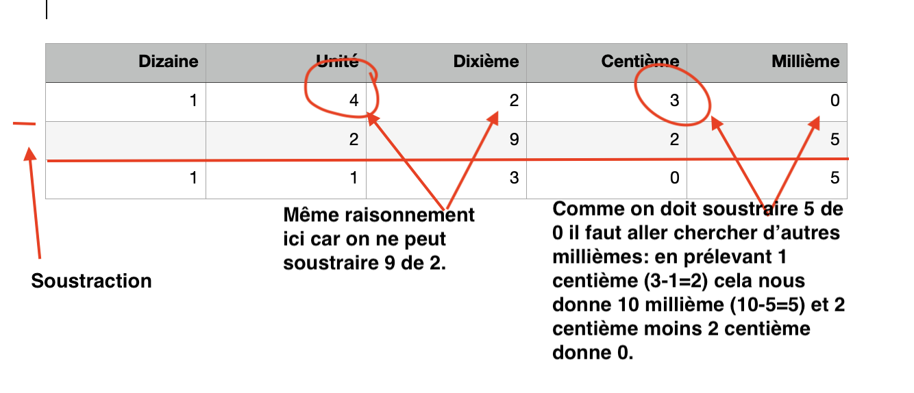 Menez la soustraction suivante en procédant à partir de la décomposition des nombres et en utilisant l’écriture fractionnaire (fractions décimales). Le traitement de l’opération doit se faire sur ces nombres décomposés (et non à partir de l’algorithme sur les nombre décimaux). Organisez clairement l’opération et explicitez brièvement les échanges nécessaires.