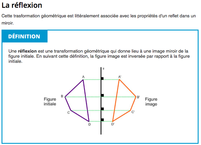 La réflexion est aussi une transformation géométrique, c'est l'image miroir d'une figure. En d'autres mots, si tu plaçais un miroir devant une figure, l'image que tu obtiendrais sur ce miroir est la réflexion de la figure initiale!