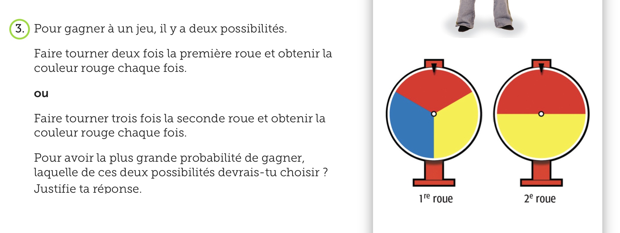 Bonjour, si j'étais toi je commencerais par mettre mes probabilités sur des fractions donc la première roue il y a 1 probabilité sur 3 d'obtenir la couleur rouge don 1/3 ensuite on dis qu'elle tournera 2 fois donc qu'elle est l'opération à faire ? _ probabilités sur _ d'obtenir la couleur rouge alors __ ensuite la deuxième roue il y a une chance sur 2 d'obtenir la couleur rouge donc 1/2 et elle tourne 3 fois donc __ alors nous avons __ pour la première roue et __ pour la deuxième roue donc laquelle des roue est la plus probable d'obtenir la couleur rouge? et bien celle qui a son nominateur plus grand laisse moi savoir si c'est plus clair :)
