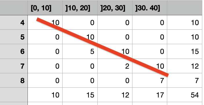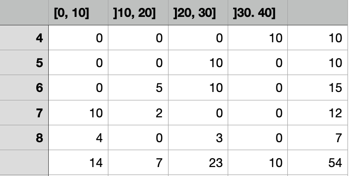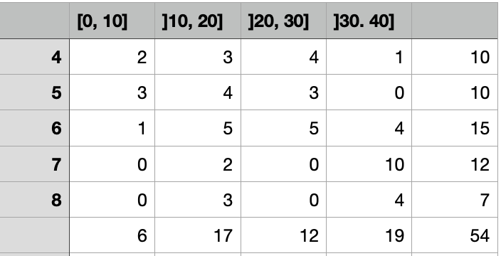 Dans un tableau à double entrée tu as donc deux variables placées en ordre croissant. Chaque case représentant le nombre d'observations dans chaque catégorie.