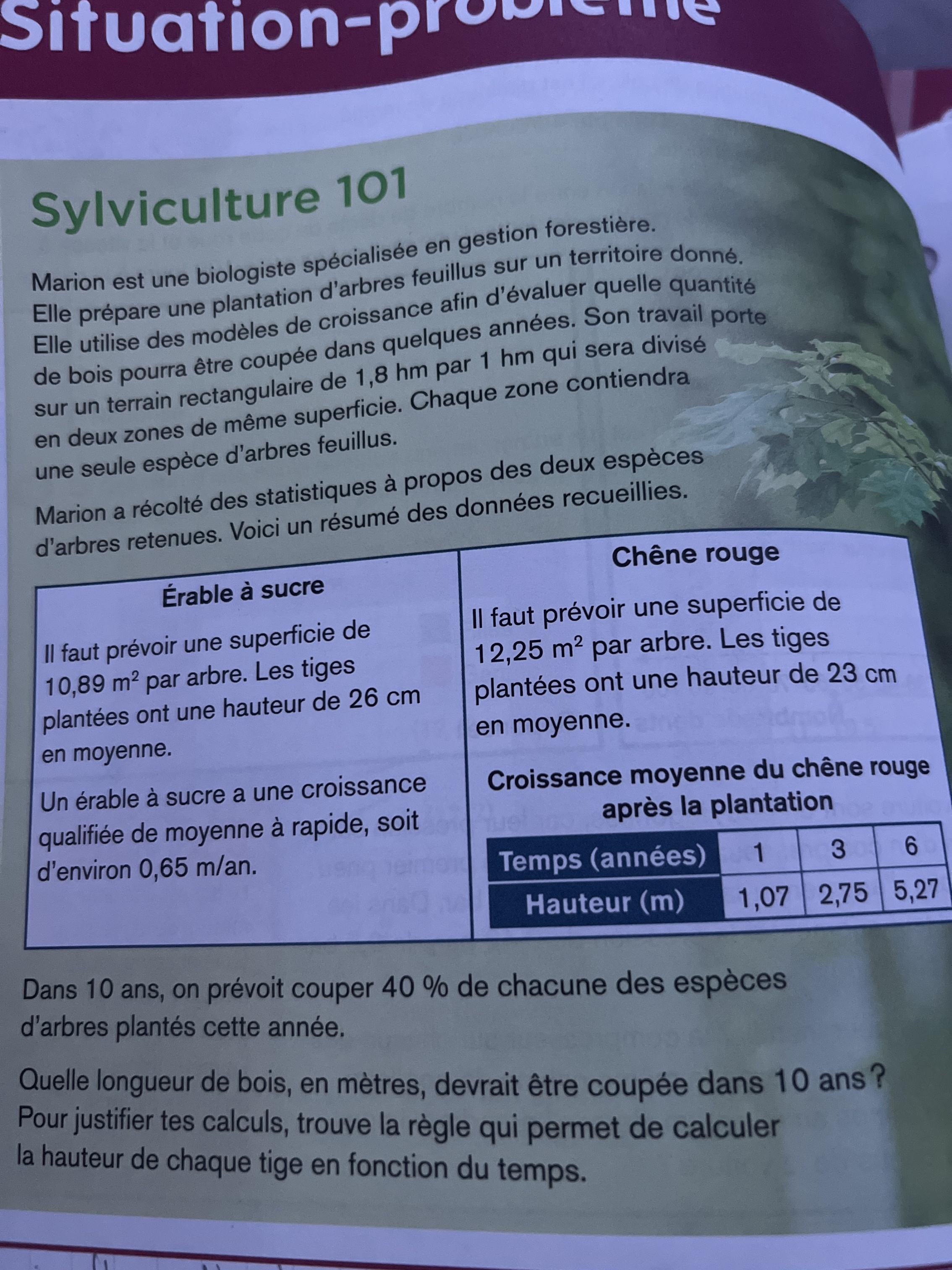 L'exercice se divise en deux parties. La première est de calculer le nombre d'arbre de chaque espèce au total. Pour ce faire, tu dois calculer l'aire totale et la diviser par deux. Tu dois aussi convertir les mesure en mètre :